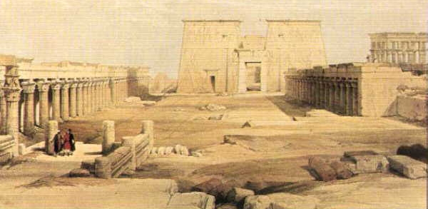 Each day, the sun, the Aten, the boat of Rei, rose from the horizon, behind the mountains where it appeared as Horus with outspread golden wings each day, and travelled across the sky and died as Ausar in a blood red sky behind the western mountains. The sun passed through the twelve hours of the day from birth to death and as it passed from view travelled another twelve hours of the night through Tuat, the Underworld, battling the forces of Set to be resurrected victorious the next morning as the great sun god Horus. The whole purpose of the residents of the island was to aid Rei in his passage across the sky and to pray for his victory in Tuat over Set. It is for this reason the Egyptians called Philae 'The Island of The Time of Rei'.